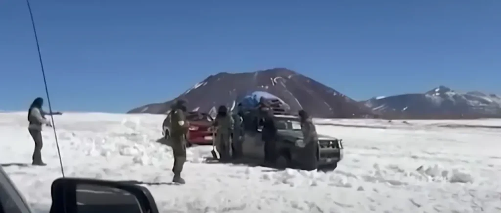 En las imágenes se observa que dos vehículos se encontraban parados en la nieve, mientras sus ocupantes utilizaban palas para intentar de liberarlos.